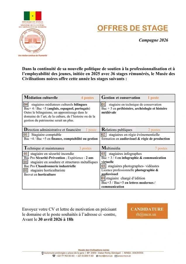 Musée des Civilisations noires offre cette année les stages 2026 suivants …… Emplois & Stages Recrutement 18 avril 2026 Commenter Dans la continuité de sa nouvelle politique de soutien à la professionnalisation et à l’employabilité des jeunes, initiée en 2025 avec 36 stages rémunérés, le Musée des Civilisations noires offre cette année les stages 2026 suivants Concours SN 18 avril 2026