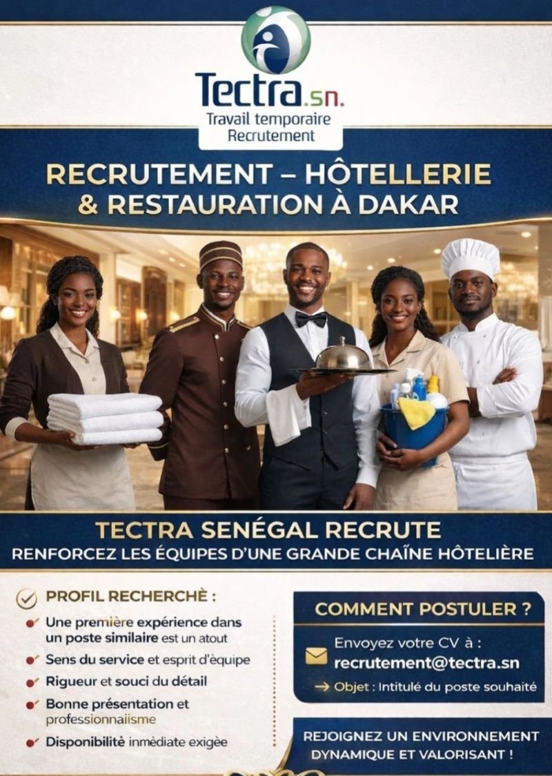 Dans le cadre d’un partenariat avec une très grande chaîne hôtelière de la place, Tectra Sénégal recrute plusieurs profils motivés et disponibles immédiatement pour renforcer ses équipes :